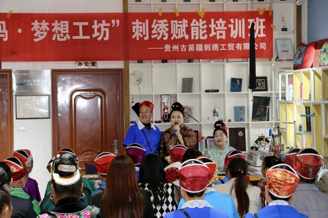 培训期间,刘英还带领绣娘们参观了贵州古苗疆刺绣工贸有限公司博物馆、新产品展示馆、现场直播间,讲述苗绣与公司的发展历程,以及苗绣的创新和市场需求,大大增进绣娘们的民族自信、文化自信和公司发展信心,也让她们相信,手中的针与线,将绣出生活的美好蓝图。