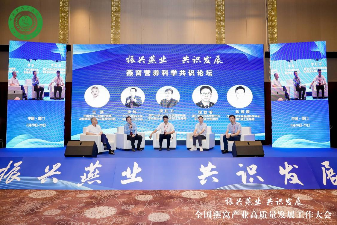 为推进燕窝产业高质量发展和品牌建设,稳固业态基础,营造行业良好的经营氛围,6月28日-29日,由中国食品工业协会主办,燕之屋协办的“振兴燕业,共识发展”2023全国燕窝产业高质量发展工作大会在厦门盛大举行。中国食品工业协会副秘书长张京玉,中国食品工业协会燕窝及胶类蛋白食品工作委员会会长王强,燕之屋品牌总监沈晓聪,马来西亚燕窝产业出口协会会长、拿督蔡千根,柬埔寨燕窝生产出口协会会长吴慧珍,中国医学科学院北京协和医院临床营养科主任医师马方,福建省农林大学食品学院副院长张怡,香港科技大学研究员董婷霞,华南理工大学教授任娇艳,江南大学未来食品科学中心教授、硕士生导师陈茂深,广州中医药大学教授、博士生导师李耿,厦门大学公共卫生学院副教授、硕士生导师李红卫,等领导、专家和嘉宾出席大会。众多食品行业及燕窝行业专家学者、企业家、从业者共聚一堂,共同探讨燕窝行业未来发展规划。