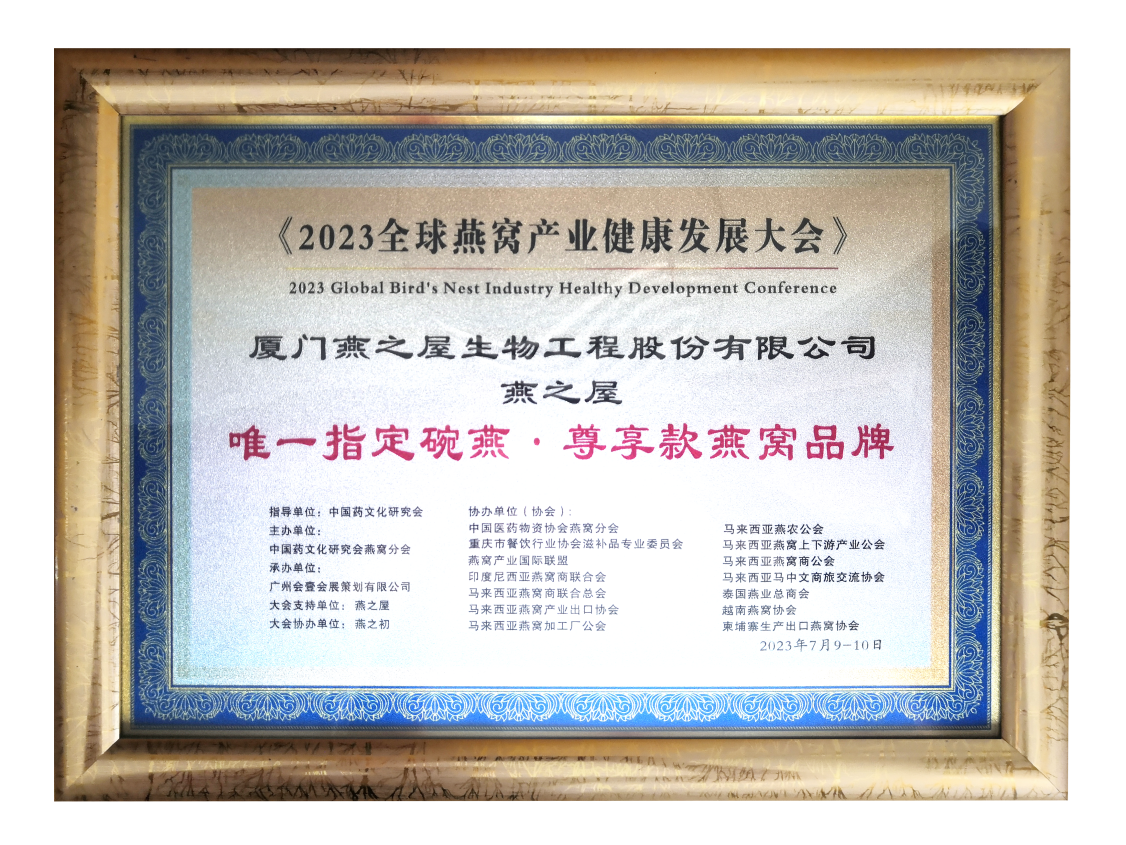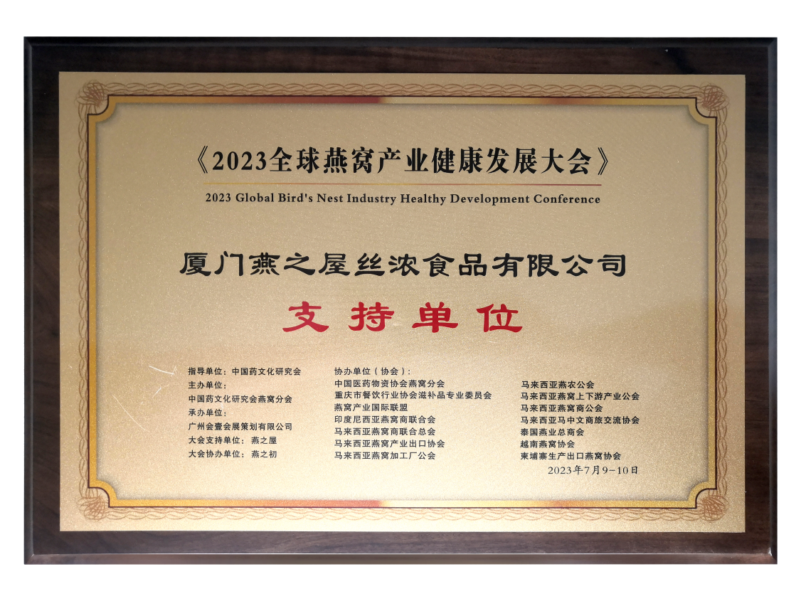 图:燕之屋获2023 全球燕窝产业健康发展大会支持单位牌匾