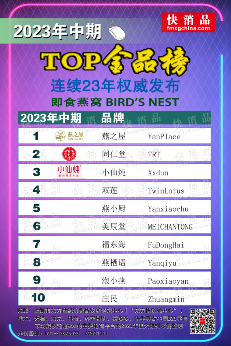 近日,东方快消品中心同行业领先的全媒体——《快消品(网)》发布“2023年中期线上TOP金品榜——燕麦奶、即食燕窝”。其中,燕之屋夺得即食燕窝品类冠军。同仁堂、双莲等知名品牌进入榜单。