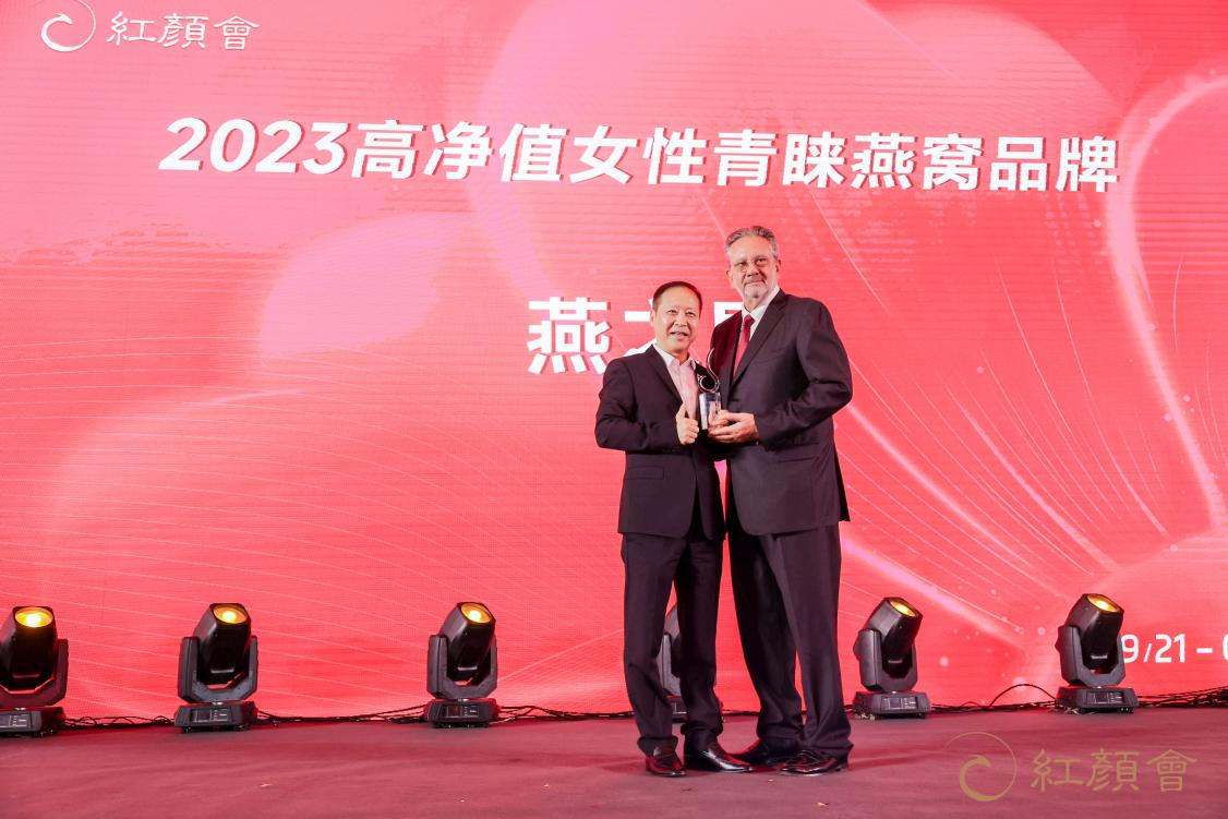 图:燕之屋荣获2023最受中国高净值女性青睐品牌(左:燕之屋创始人、董事长黄健,