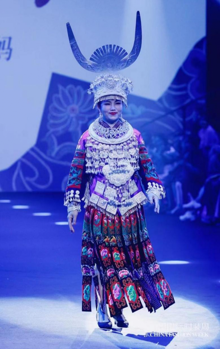图:燕之屋“天才妈妈”贵州苗绣梦想工坊主理人刘英登上中国国际时装周走秀舞台
