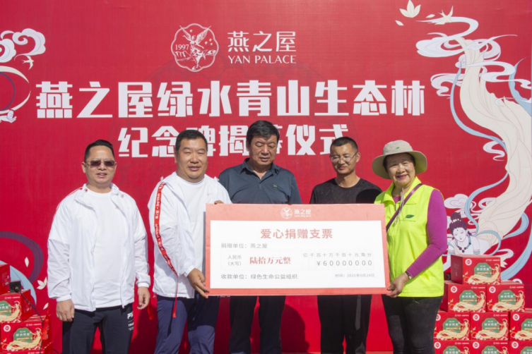 2002年,NPO绿色生命组织理事长易解放踏上植树造林的公益之路,20余年间,从内蒙古到甘肃,累计绿化4万亩沙漠和戈壁,在绿色生态公益组织的带动下,一批又一批的志愿者加入到“造绿”的队伍中。作为燕窝行业“领头燕”,燕之屋坚持奉行“人与自然和谐共生”的生态理念,以实际行动守护青山绿水。2021年,燕之屋接过“绿色生命”接力棒,携手NPO绿色生命组织理事长易解放走进敦煌,与二十多位燕之屋粉丝共同种下树苗,一起见证燕之屋绿水青山生态林揭碑仪式,并向NPO绿色生命环保公益组织捐款,共同为敦煌筑起防风固沙生命线,守护人与自然和谐之美。