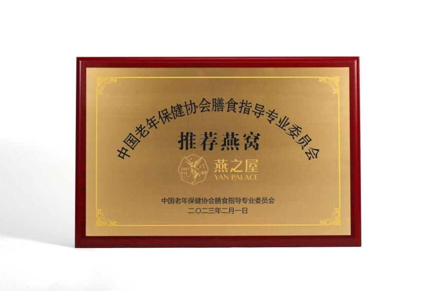 图:燕之屋荣获中国老年保健协会膳食指导专业委员会推荐燕窝荣誉牌匾、