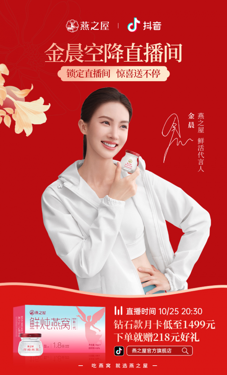 10月25日,燕之屋官宣青年演员、舞者金晨成为燕之屋鲜活代言人。同日,金晨作为燕之屋鲜活代言人,亮相燕之屋官方直播间,与主持人马锐欢乐互动,直播间反响热烈。