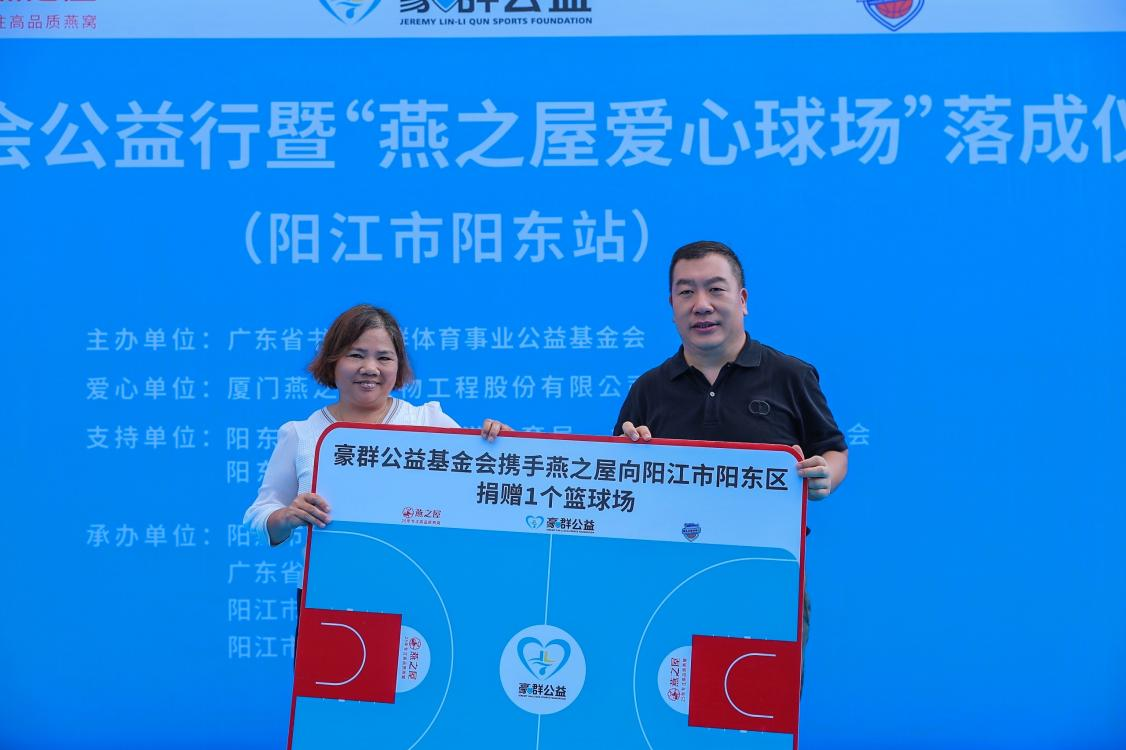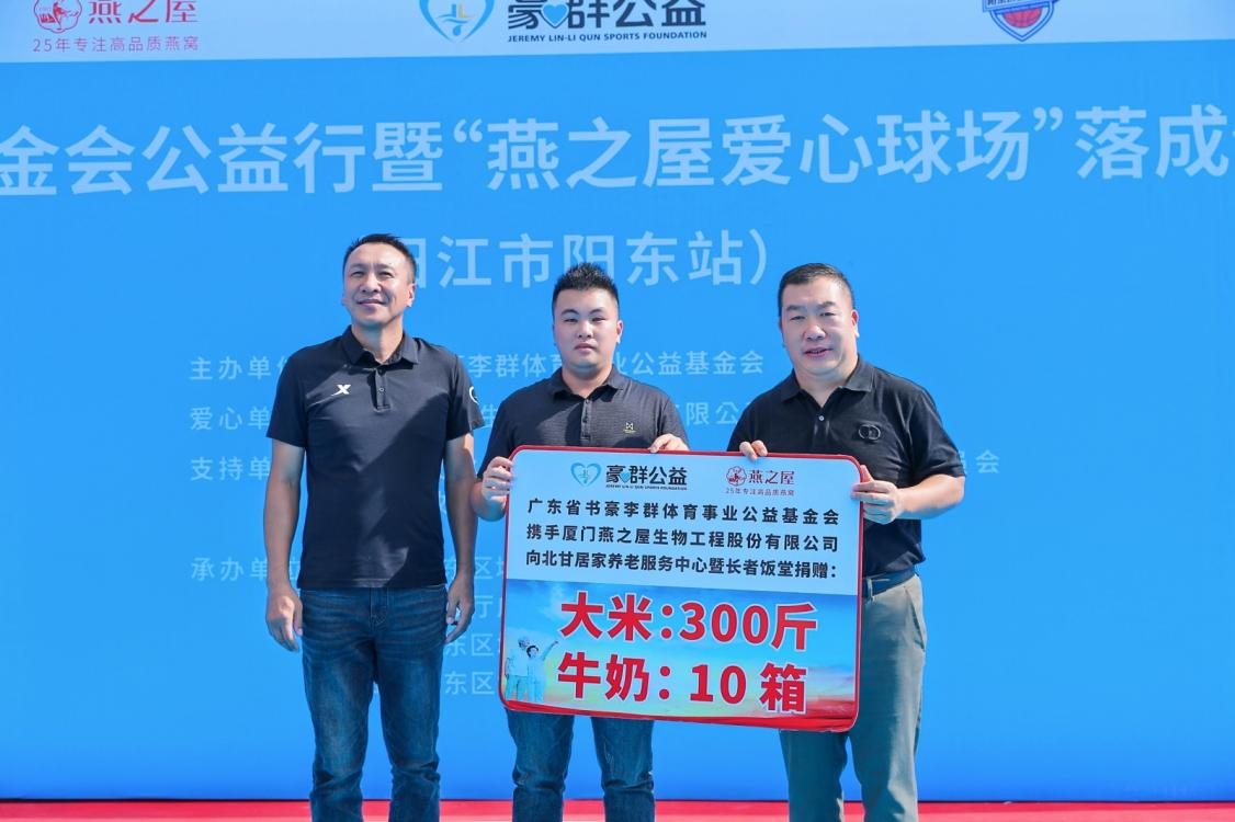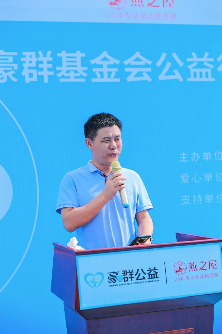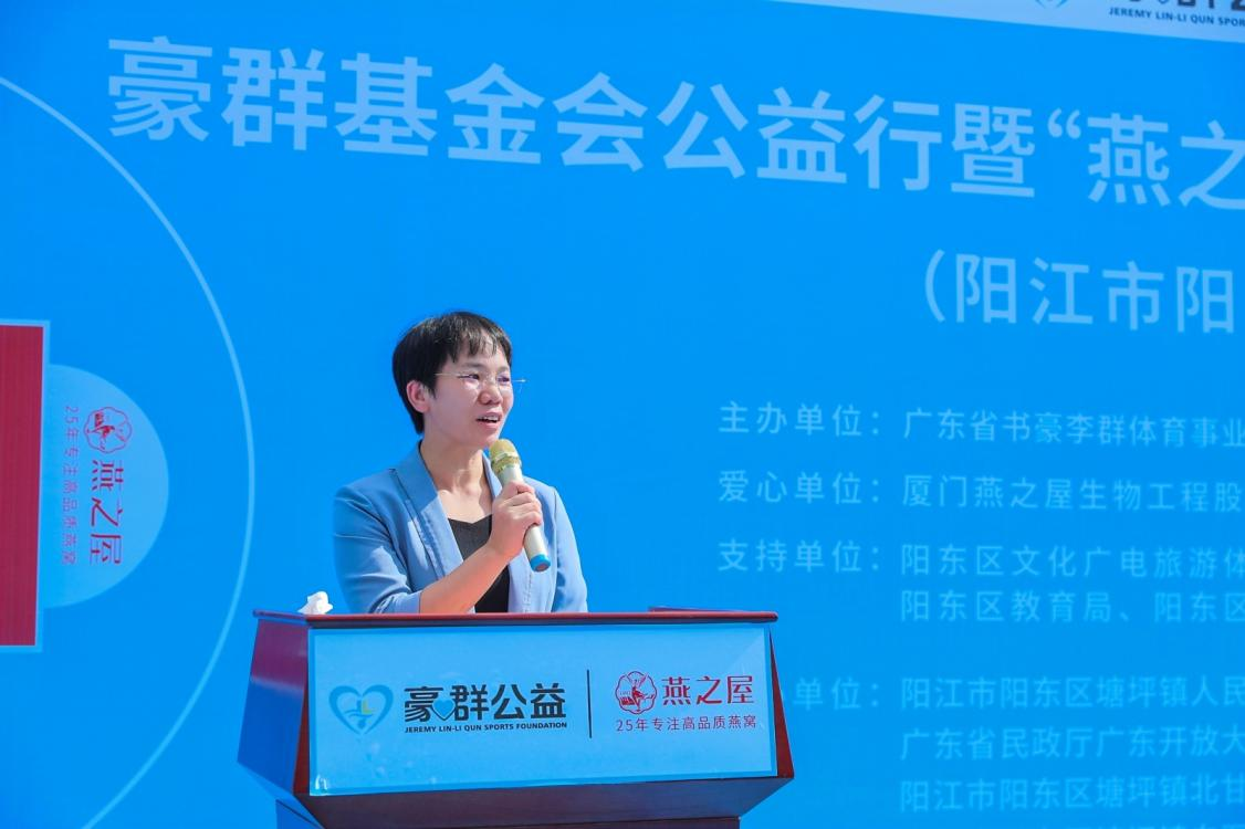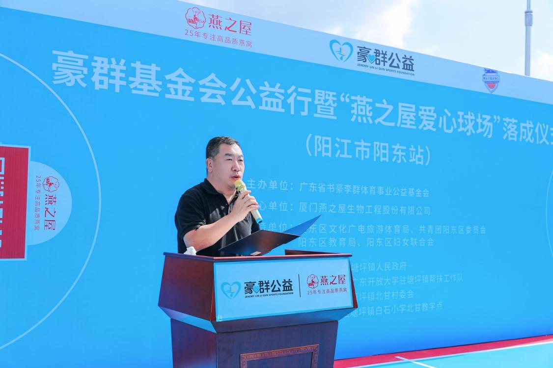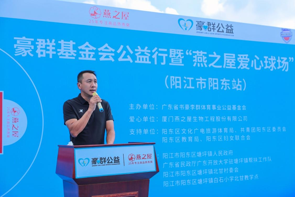 广东省第十三届政协委员、中国篮球名宿、广东省书豪李群体育事业公益基金会理事长李群在致辞中提到,9月份,豪群基金会携手爱心企业燕之屋和燕之屋总裁李有泉,一同为阳东区捐建的公益球场率先在北甘村完工,为村民提供全新的运动场所,并对燕之屋以及燕之屋总裁李有泉对公益的关注和支持表示感谢。