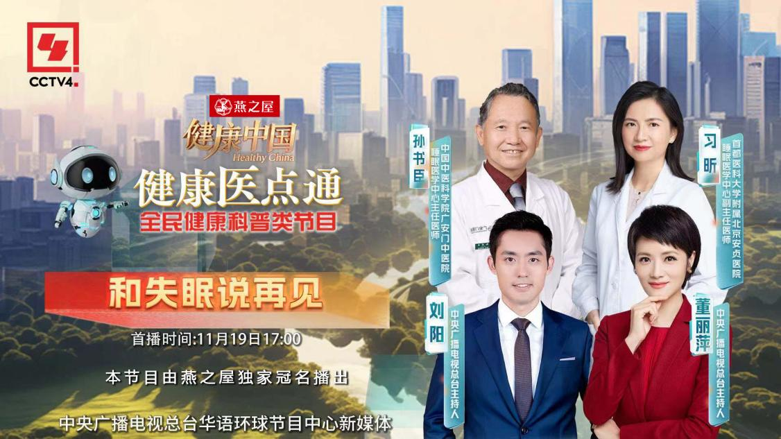 本期,由燕之屋独家冠名的CCTV-4大型健康类栏目《健康中国》邀请来自首都医科大学附属北京安贞医院睡眠医学中心的副主任医师习昕,为观众解读失眠的定义,带领大家一起了解失眠对身体的危害,传授失眠的解决办法,相约《不在天亮说晚安》。