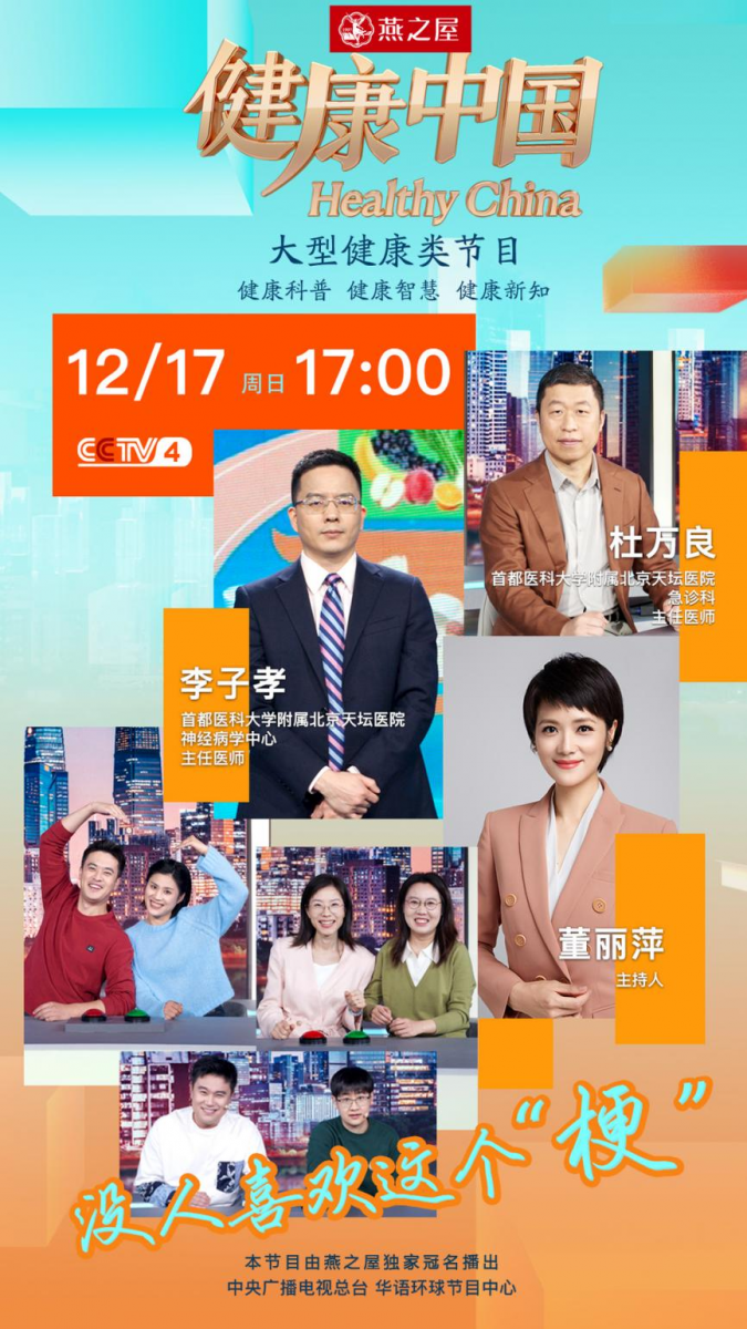 本期,由燕之屋独家冠名的CCTV-4大型健康类栏目《健康中国》特邀首都医科大学附属北京天坛医院急诊科主任医师杜万良和首都医科大学附属北京天坛医院神经病学中心主任医师李子孝为大家解读脑梗死,从专业的角度分析它的致病机理和预防手段。