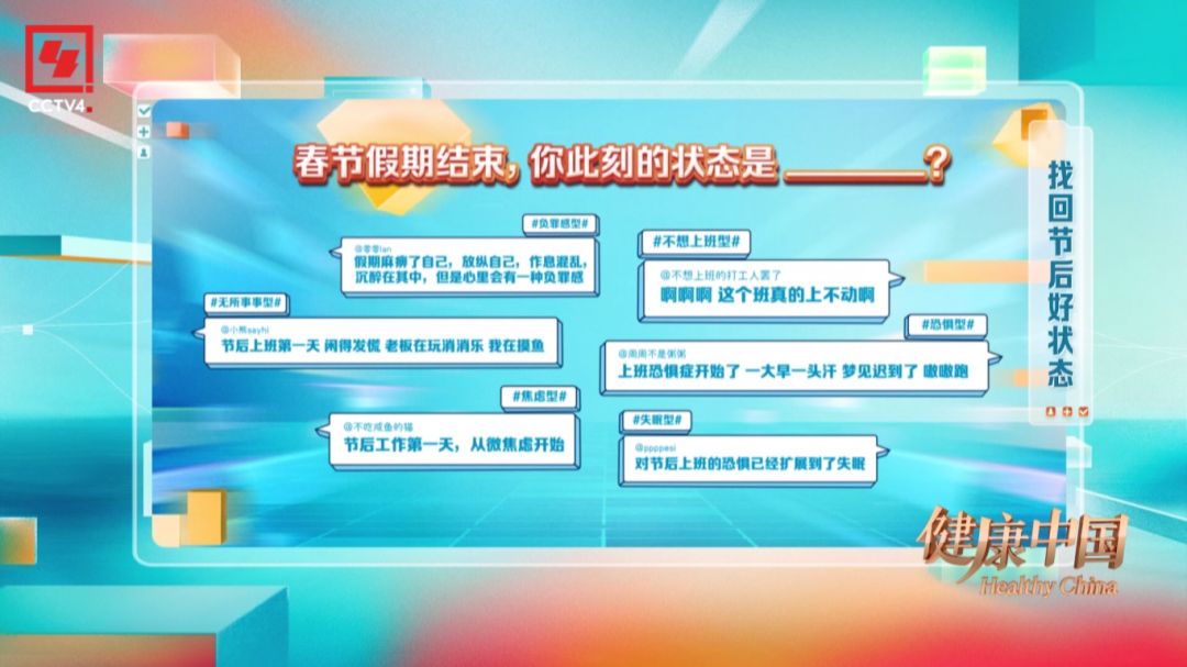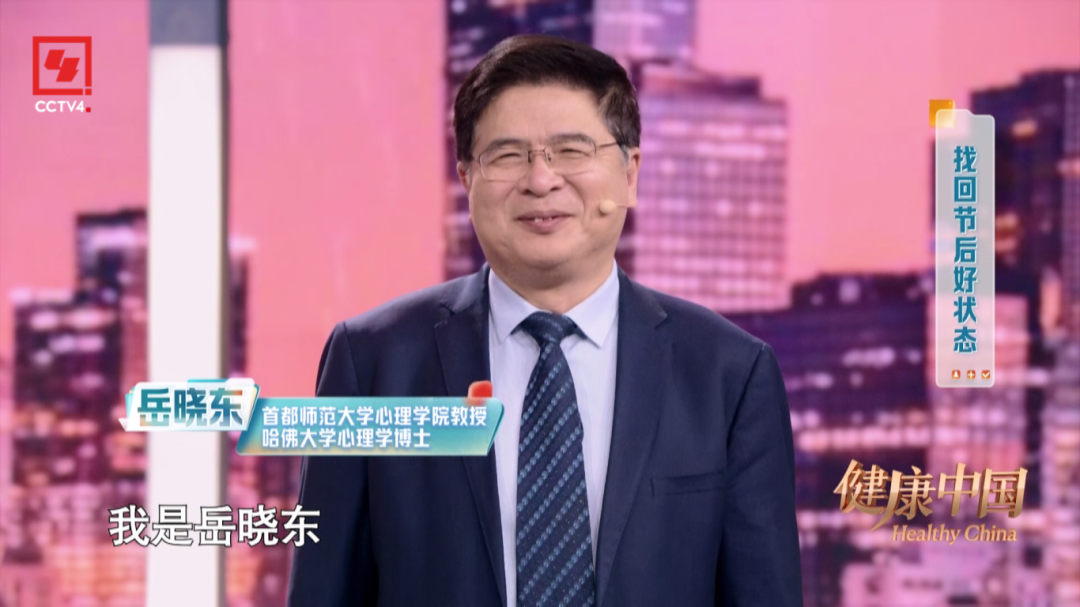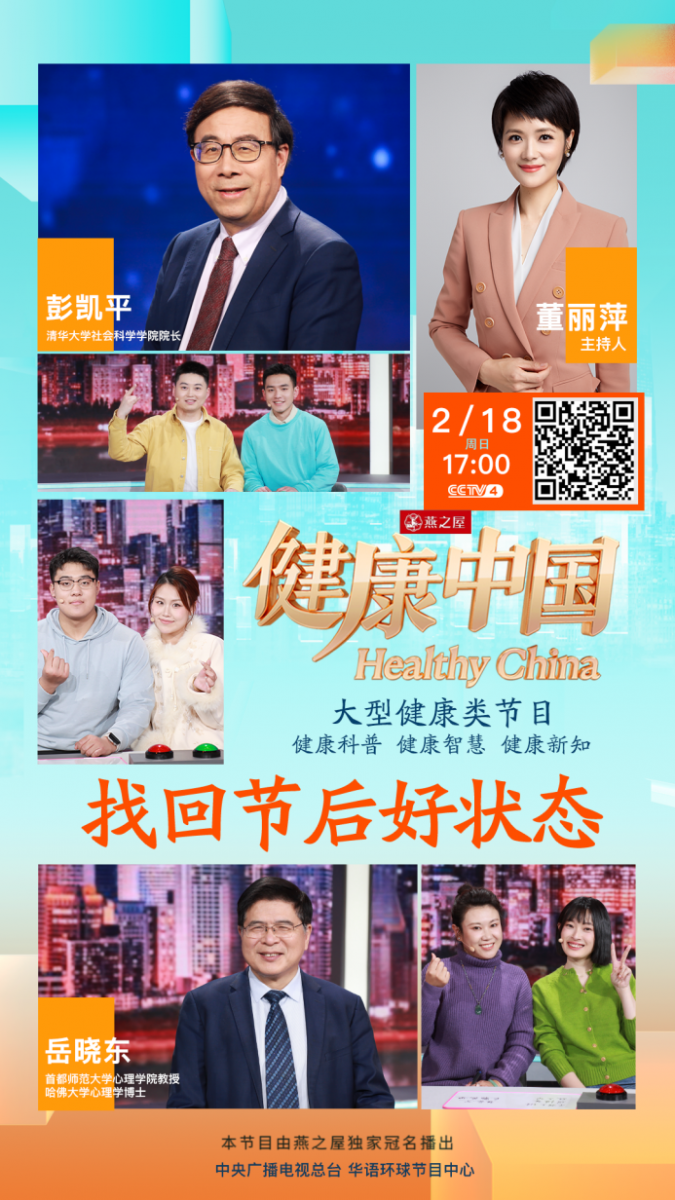 本期,由燕之屋独家冠名的CCTV-4大型健康类栏目《健康中国》特邀首都师范大学心理学院教授、哈佛大学心理学博士岳晓东和清华大学社会科学学院院长彭凯平教授,以及北京大学第三医院运动医学科的苗欣博士,与您共同探讨如何找回节后好状态。