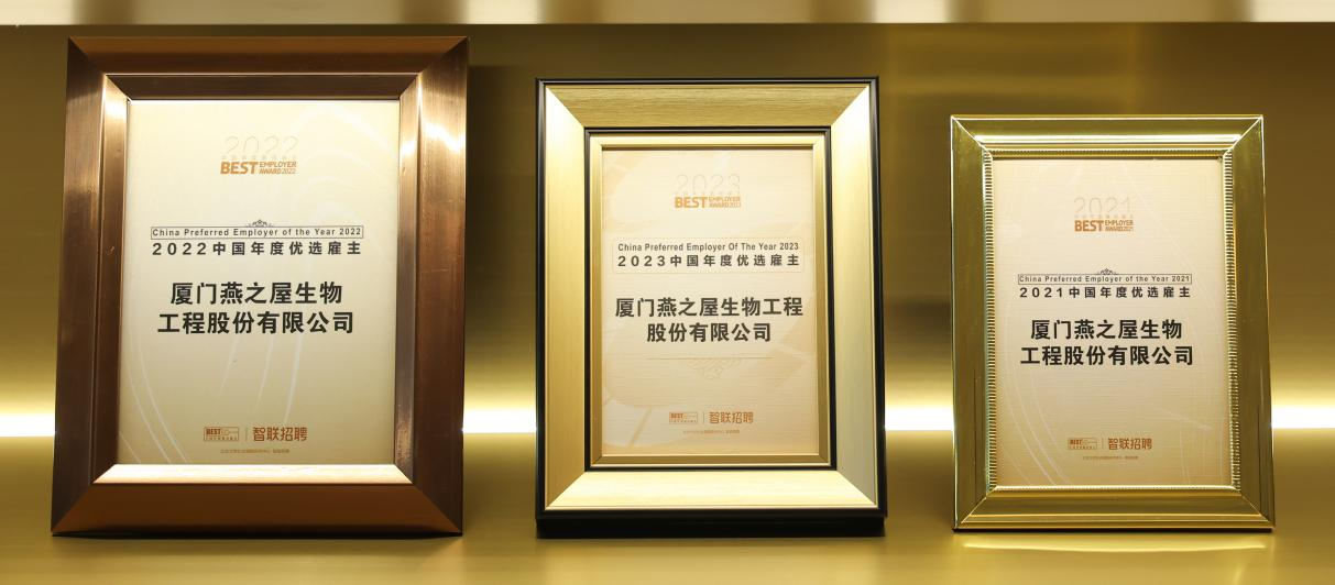 一直以来,燕之屋坚持创新实干、行稳致远,树立专业、活跃、有爱的企业形象,打造企业与员工之间良好、和谐的劳动关系,彼此信任、相互成就。2022年至2023年,燕之屋陆续被授予“福建省2020-2021年度省级劳动关系和谐企业”、2023年度厦门市“双爱典范”企业称号。此次荣获2023中国年度优选雇主荣誉,再度提升企业口碑声誉,彰显企业实力与魅力。