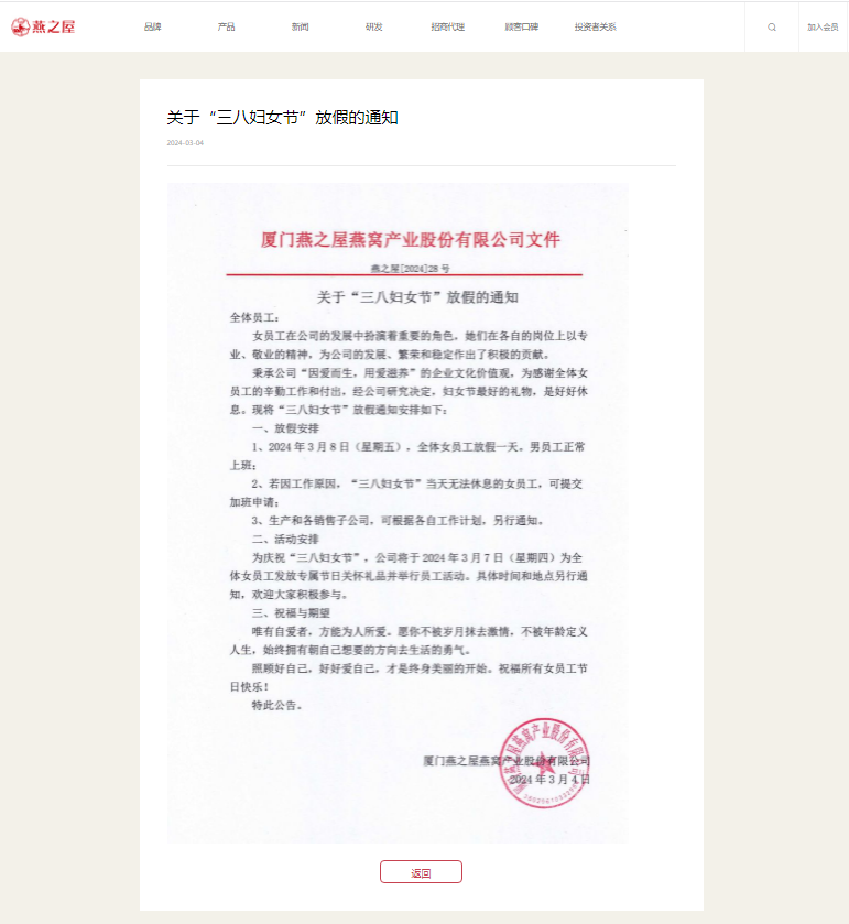 燕之屋视员工为企业的宝贵财富,秉持“因爱而生,用爱滋养”的品牌理念,给予员工充分的尊重和肯定,努力将企业构筑成为“职工之家”。工作环境上,以多元一体化的公司结构、现代舒适的办公区域,给予员工更加便捷、轻松的工作氛围,激发员工工作热情。人文关怀上,创新构建多项企业活动、部门赛事,从“明日之星”新员工培训会、员工谈心会、燕窝研究院燕窝美食大赛到燕窝研究院感官评价技能大赛、技术储备新品推介会等活动,为职工带来归属感与幸福感。福利制度上,除每年法定节假日之外,燕之屋还为企业员工制定了“无因假”制度,即每个月可无条件申请半天带薪假。近日,燕之屋还发布了“三八妇女节”放假通知,今年3月8日,全体女员工放假一天,以此感谢女员工的辛勤工作和付出。