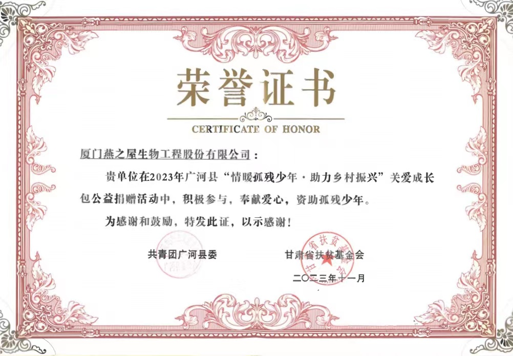 图:燕之屋荣获广河县“情暖孤残少年·助力乡村振兴”关爱成长包公益捐赠活动荣誉证书
