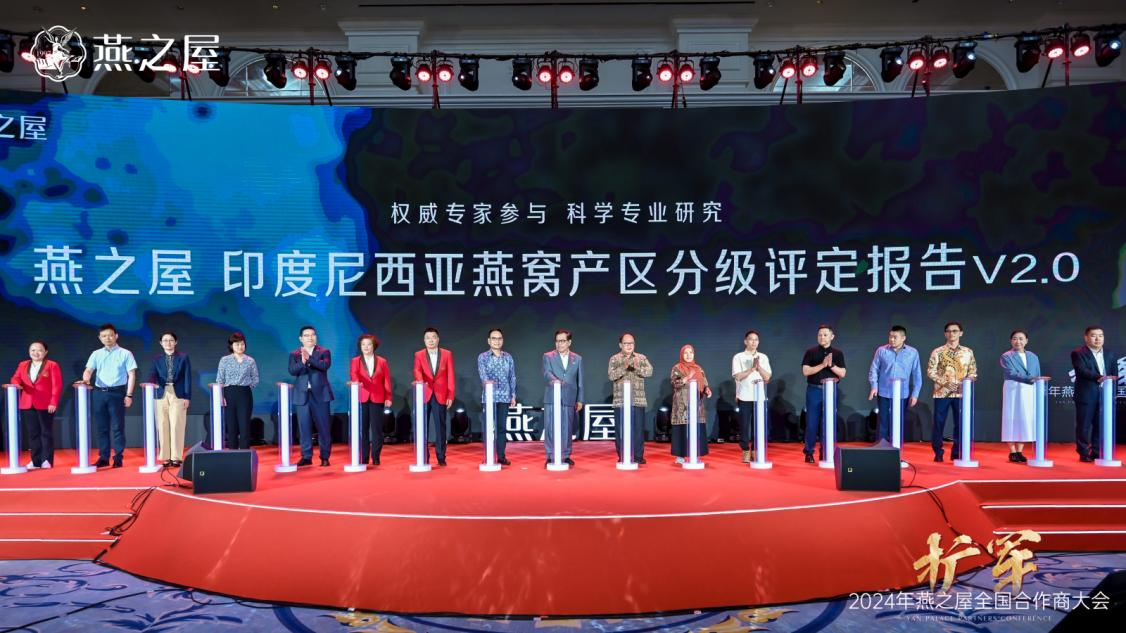 《燕之屋印度尼西亚燕窝产区分级评定报告V2.0》立足于燕窝产业实际需求,为行业以及消费者甄选高品质燕窝提供科学依据和参考,推动行业消费升级,促进燕窝市场的健康发展,同时也彰显了燕之屋的品牌专业度与市场引领力。现场,印度尼西亚驻华大使周浩黎,印度尼西亚动植物检疫标准检验中心主任斯利扬托,厦门海关技术中心、国家燕窝及燕窝制品检测重点实验室主任徐敦明,印度尼西亚动植物检疫标准检验中心研究员海尔米,印度尼西亚燕窝协会养护部部长安东,印度尼西亚燕窝协会国际贸易部副部长何文辉,江南大学未来食品科学中心钟芳教授、陈茂深教授,华南理工大学食品科学与工程学院任娇艳教授,印度尼西亚027工厂董事长鲁迪,印度尼西亚004工厂普尔沃苏特里斯诺,印度尼西亚014工厂露西亚娜,燕之屋执行董事、副董事长郑文滨,燕之屋执行董事、总裁李有泉,燕之屋董事、副总经理、供应链中心总经理黄丹艳,燕之屋副总经理、研发技术总监范群艳,燕之屋供应链中心总监魏溦等领导和嘉宾共同按下灯柱,《燕之屋印度尼西亚燕窝产区分级评定报告V2.0》正式发布。