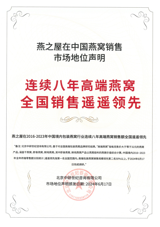 近日,根据北京中研世纪咨询有限公司统计显示,燕之屋连续八年高端燕窝全国销售第一*(*燕之屋在2016-2023年中国境内包装燕窝行业连续八年高端燕窝销售额全国第一)、燕之屋连续八年高端燕窝全国销售遥遥领先*(*燕之屋在2016-2023年中国境内包装燕窝行业连续八年高端燕窝销售额全国遥遥领先),不仅体现了燕之屋硬核的产品力和强大的品牌影响力,也证明了其在燕窝行业的头部地位。