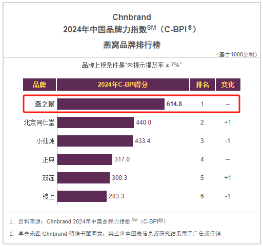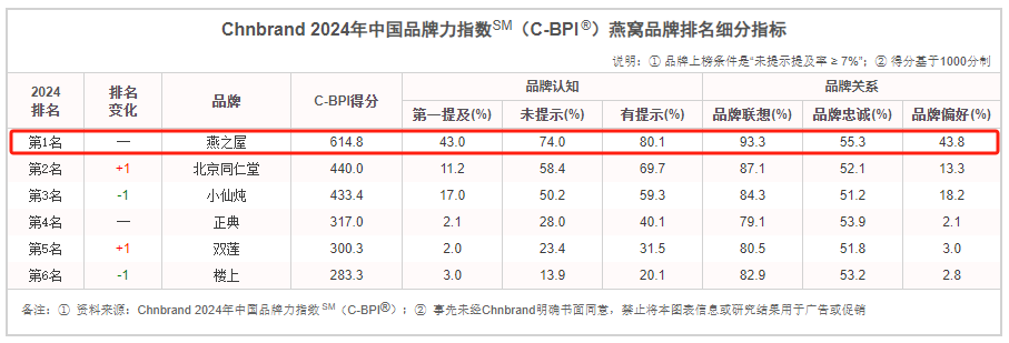 近日,2024年中国品牌力指数SM(C-BPI®)品牌排名和分析报告重磅发布,燕之屋以614.8分的优异成绩,荣登燕窝品牌排行榜榜首。至此,燕之屋已连续五年问鼎中国品牌力指数SM(C-BPI®)燕窝品类榜首。