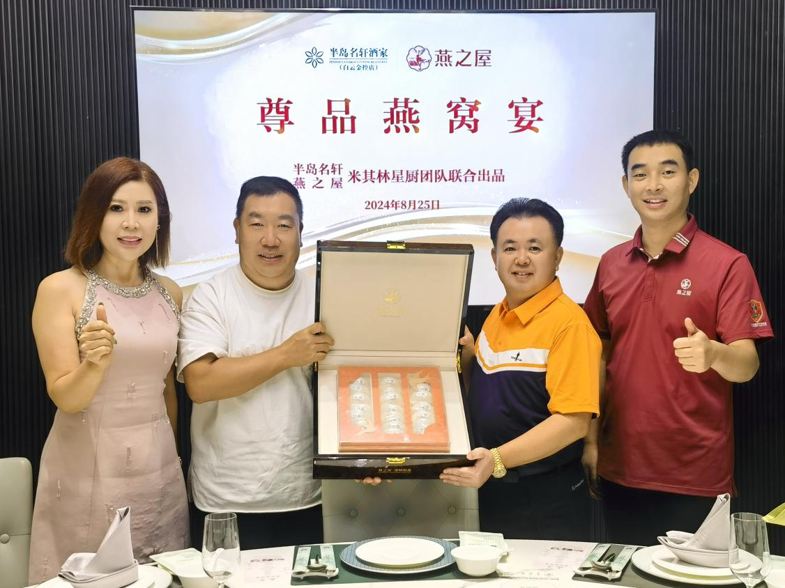 中秋节前夕,燕之屋与半岛名轩酒家(白云金控店)联合出品尊品燕窝宴,融合燕窝文化与美食文化,创新高端滋补新体验;下一步,尊品燕窝宴将陆续进驻半岛名轩酒家所有高端门店,燕之屋将持续实践“源于天然,美与健康”的理念,为国民实现美好生活助力。