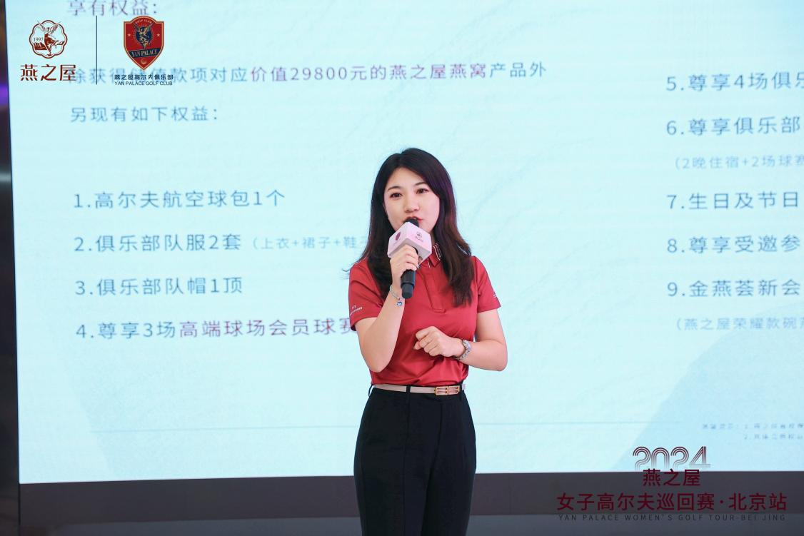 燕之屋26年专注高品质燕窝,践行“源于天然,美与健康”的理念,与高尔夫运动所蕴含的健康生活理念深度契合。燕之屋以高尔夫运动为纽带,在全国范围内建立燕之屋高尔夫俱乐部,致力于打造一个集高端赛事、精英沙龙、休闲交流于一体的综合性平台,为广大高尔夫爱好者提供了一个竞技交流、展示美、传递美的舞台,让每一位成员都能在这里找到归属感,享受高品质生活带来的愉悦与满足。席间,燕之屋北京高尔夫俱乐部秘书长徐可上台为嘉宾们详细介绍燕之屋高尔夫俱乐部,传递“因爱而生,为爱挥杆”健康理念,并向在座嘉宾发出会员邀请。