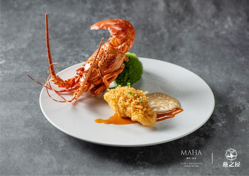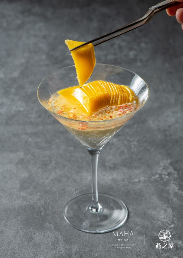 秋葵黄鱼燕窝羹,燕窝经净水浸沐6小时,换水涤尘,撕作雪丝隔水轻炖;黄鱼淋开水封鲜,煎至金黄生香,捣碎入滚水熬至浓白;秋葵片灼水,如玉簪点入羹中。这一盅融深海之鲜、燕窝之润、青蔬之清——沿袭古法,让食养同源的美味在舌尖化开。发酵酸汤龙虾趴燕窝汁,龙虾肉冷腌15分钟,裹上特调浆粉炸出金黄蜂巢脆衣,咬下时“咔嚓”声如秋叶碎响。番茄经自然发酵成琥珀酸汤,浇淋现炖燕窝汁——酸鲜激荡中,燕窝柔滑如绸缎抚过舌尖,是主厨献给味觉的冒险诗篇。芒果酒酿桂花蜜蛋糕配新鲜芒果及燕窝:“燕窝需隔水轻蒸,裹住桂花蜜的魂。”主厨将酒酿熬作凝脂奶冻,托起卡曼橘芒果慕斯的俏皮酸香。顶层燕窝如琉璃冻雨,新鲜芒果是点睛明月。撒入桂花,取“蟾宫折桂”的好兆头。当瓷勺探底——酒酿的醇厚、慕斯的轻盈、燕窝的滑润在口中共谱秋月的诗篇。