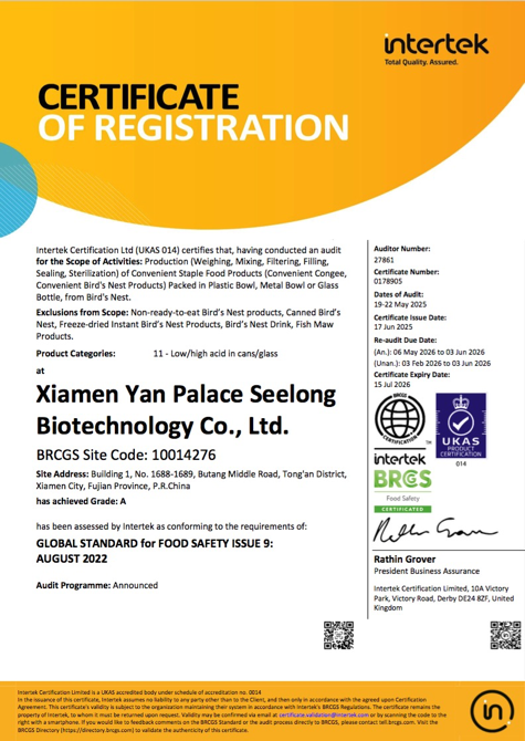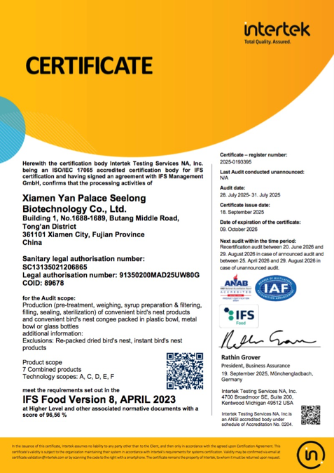 图:燕之屋获得BRC食品安全全球标准、IFS国际食品标准双重认证