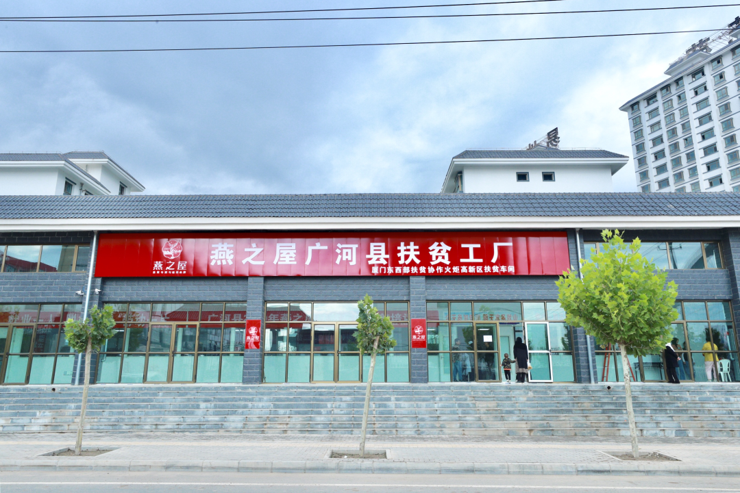 甘肃广河县是国家确立的第一批扶贫开发工作重点县,2019年,燕之屋在甘肃广河县建设燕之屋广河县扶贫工厂(一期),占地总面积为1076㎡。2020年,燕之屋再次开启新篇章——燕之屋广河县扶贫工厂二期建成启动,总占地面积923.3㎡,两个工厂共可提供300个就业岗位,截至目前,燕之屋广河扶贫工厂累计帮助近300个家庭实现脱贫,稳步走上致富路。