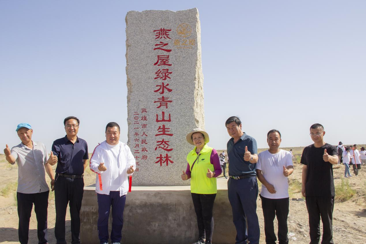 揭碑现场,燕之屋总裁李有泉先生表示:“燕之屋携手绿色生命组织,和各位远道而来的燕之屋粉丝朋友们一起,共同参与到敦煌生态建设和环境保护的绿色工作当中,加入绿色一带一路的植树行列,在这阳关林场种下属于我们的第一批树,播种下绿色的新希望。我相信,今天我们在这里种下的每一棵树,都将为敦煌增加森林面积、提高森林质量,为实现我国碳中和目标作出点滴贡献。我也相信,这也许是各位种下的第一棵树,但不会是最后一棵树,因为我们都希望我们的后辈,子子孙孙,能够生活在蓝天白云、绿水青山的美好环境当中。”