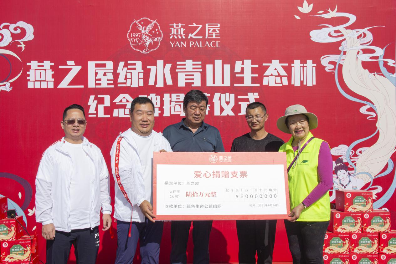 图:燕之屋总裁李有泉代表燕之屋向NPO绿色生命环保公益组织捐款人民币60万元