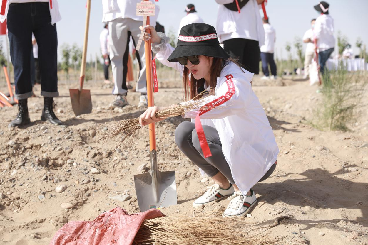 十几年前,易妈妈扎根荒漠,与黄沙为伴;十几年后,易妈妈与到场的燕之屋粉丝一起,在林场的土地上挖坑、填土,种下了一棵棵希望之树,在实地感受敦煌东方魅力的同时,践行了人与自然和谐共生的精神。