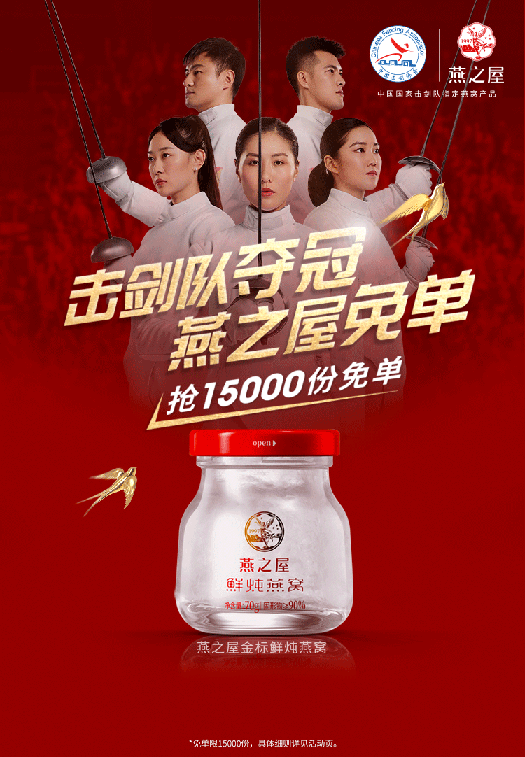 燕之屋于今年1月19日与中国国家击剑队官方合作签约仪式在厦门举行,同样的健康理念和奥运精神让二者高度契合,合作合拍。正如中国国家击剑队给国人创造无数精彩一样,燕之屋23年专注高品质燕窝,也在用自己的产品向消费者展现国货的力量!7月,燕之屋在全国启动“击剑队夺冠,燕之屋免单”活动,为中国国家击剑队鼎力撑腰!