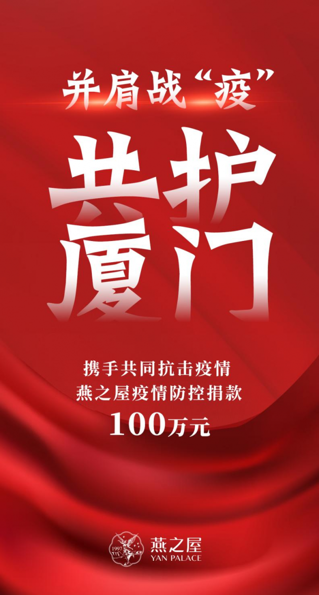 战“疫”路上,燕之屋始终与社会各界一起守望相助,为打赢疫情防控歼灭战而努力。2020年疫情期间,燕之屋也曾向武汉市红十字会、广东省钟南山医学基金会分别捐款100万元,用于新冠疫情的抗击与防治。此次,同安是厦门疫情防控阻击战的主战场,同安胜则厦门胜!燕之屋捐款100万元,助力同安疫情防控,为实现“让厦门重归美好”的共同目标注入了温暖、坚定的力量。