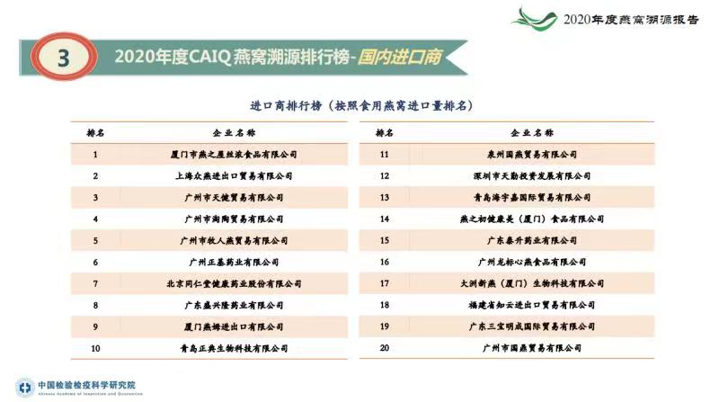图:燕之屋居2020年度CAIQ溯源燕窝国内进口商排行榜首