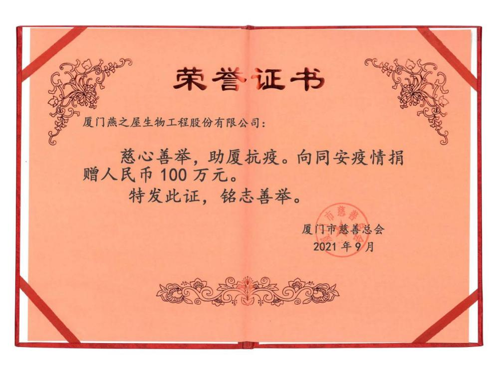 目前,厦门市疫情防控已取得阶段性成效,新冠疫情进入拖尾期。燕之屋作为本土企业,始终秉持“因爱而生,用爱滋养”的理念,此前已向厦门市慈善总会捐赠100万元,专项用于同安疫情防控工作。9月30日,燕之屋再次携手金龙客车,捐赠了厦门首台移动核酸采样车,为厦门市疫情防控提供全天候的机动保障。