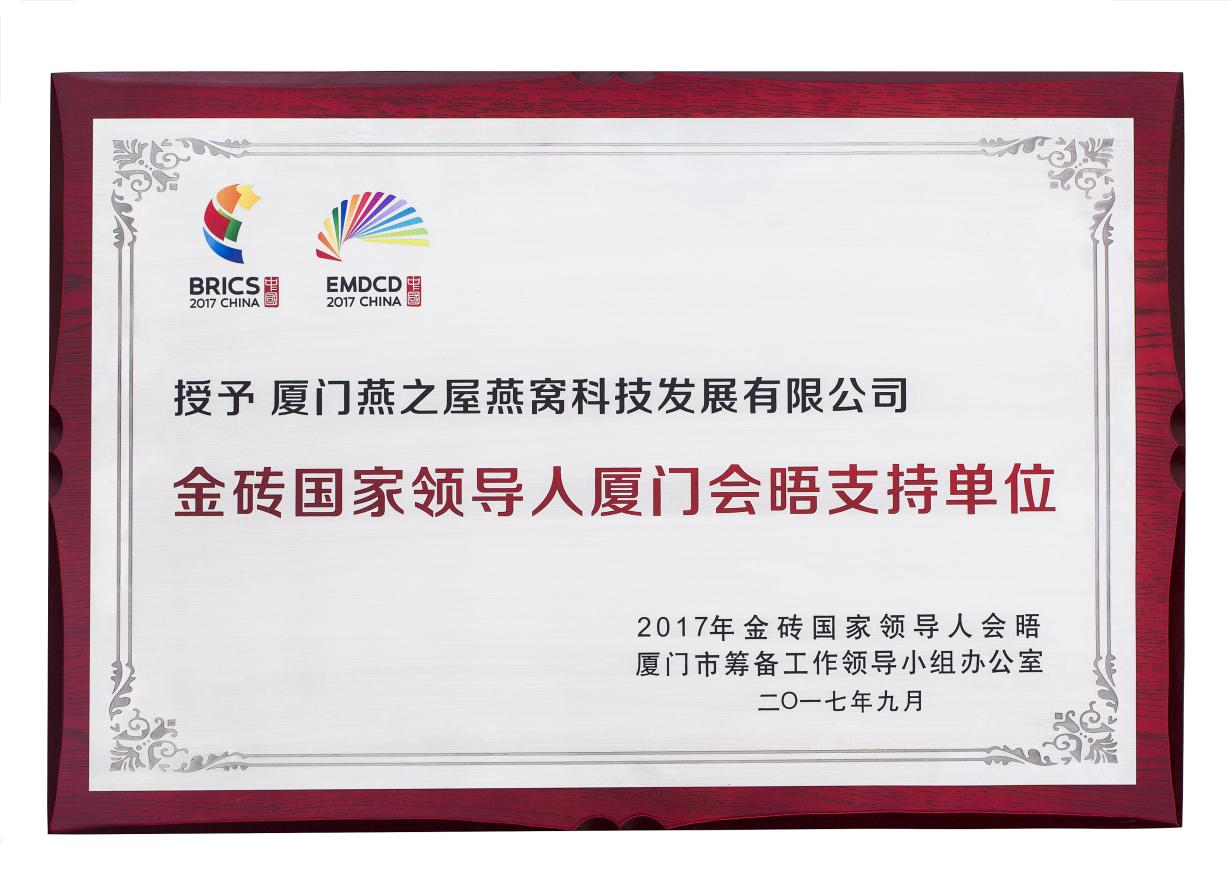 依托强大的品牌力和产品品质,燕之屋从众多同类品牌中脱颖而出,以行业头部企业的身份频频亮相国内外重要活动和高端会议场合。其中,2017年金砖国家峰会,燕之屋成为金砖国家领导人厦门会晤赞助商,为金砖峰会荣耀助力,彰显了燕之屋的行业标杆地位,也证实了燕之屋的品牌实力以及产品品质深受主流认可。