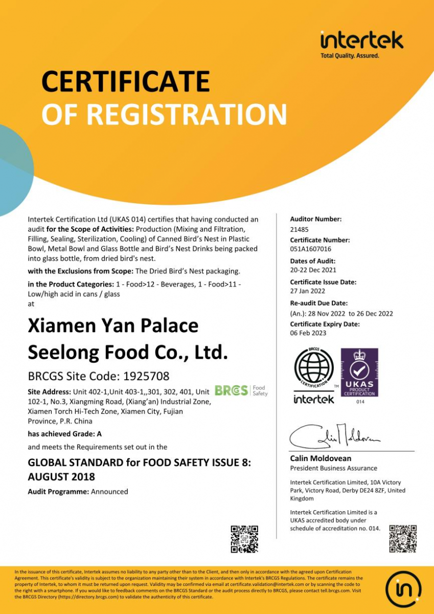 图:燕之屋获得“BRC食品安全全球标准认证”