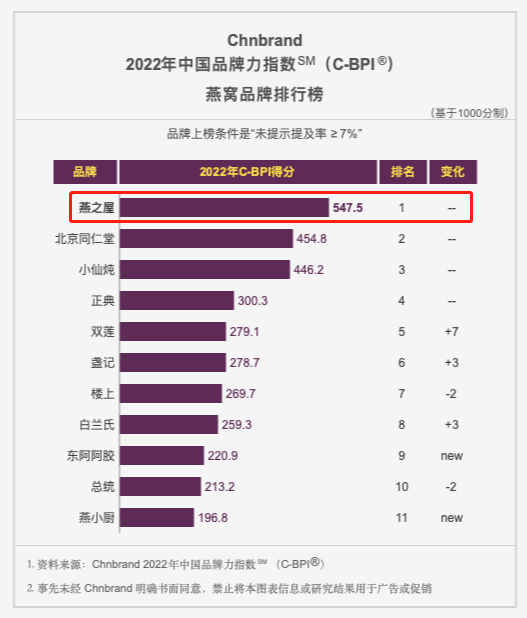 图:燕之屋荣膺“2022年C-BPI食品饮料行业燕窝品类品牌榜首”