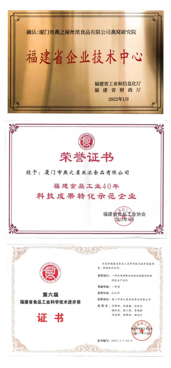 一直以来,燕之屋高度重视技术研发,在燕窝的研究和相关产品的开发创新上长期投入,持续积累,以强大的品牌力和科研实力获得行业内外肯定。2022年,燕之屋经过福建省工信厅对燕之屋燕窝研究院技术实力评定,成功获批“第三十二批省企业技术中心”称号,体现了相关专业机构和专家对燕之屋企业技术实力的肯定。今年5月27日,燕之屋更是凭借强大的品牌力、科研力、产品力等各方面综合实力,接连揽获福建省食品工业协会第十次会员大会三项大奖,燕之屋荣获“科技成果转化示范企业”、燕之屋燕窝研究项目获“第六届福建省食品工业科学技术进步一等奖”。