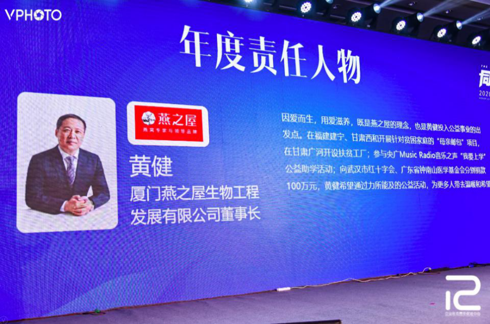 图:燕之屋董事长、创始人黄健先生获《新周刊》“2020年度责任人物”