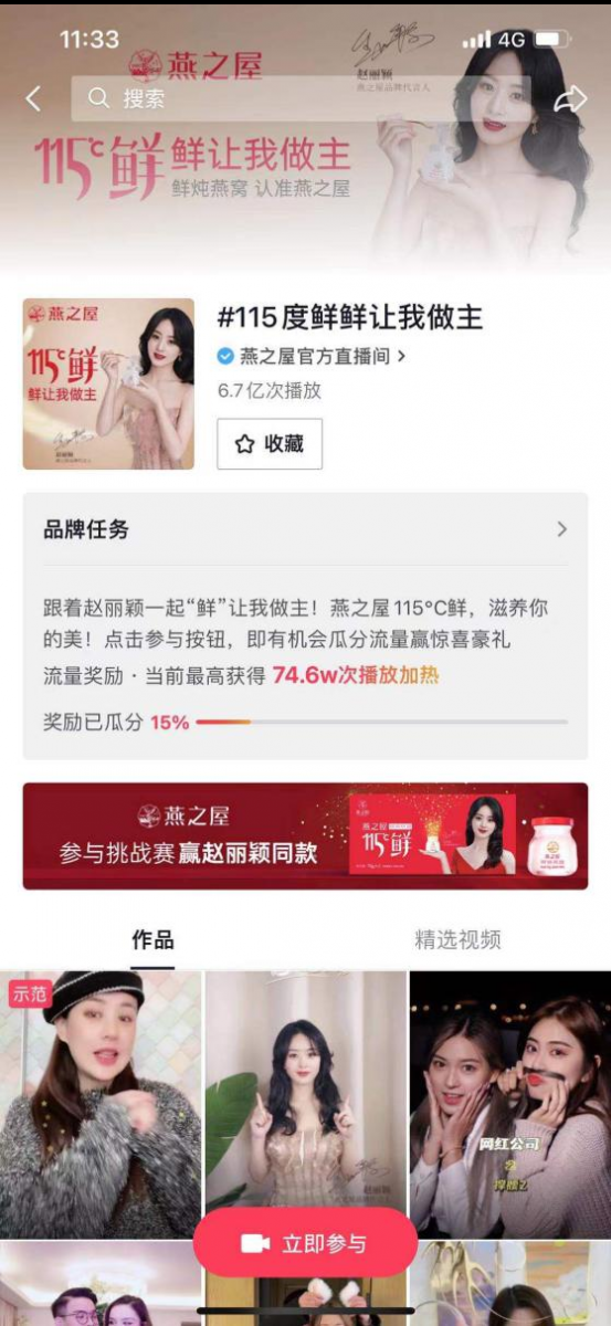 无论在公域还是私域,燕之屋始终注重消费者的需求变化,与消费者形成良性互动,完成品牌沉淀。仅在2021年,燕之屋就举办了数百场直播。并与时俱进,将短视频等新兴技术与KOL种草营销模式相结合,与受众形成更高频、更广泛的触达与链接。以燕之屋官宣全新品牌代言人赵丽颖事件为例,官宣消息一发出便收获大量热度,引发全网广泛关注与讨论。其中#赵丽颖 115度新身份#的微博热搜话题,以健康、纯粹的新形象,让消费者感知到滋补燕窝的鲜活新风尚。赵丽颖抖音“燕之舞”更是引起大量挑战互动,#赵丽颖手势舞#顺势霸屏微博热榜,短时间抖音播放量达6.7亿,互动话题持续发酵,相关热议不断。在对产品进行有效曝光的同时,燕之屋也以其自带的亲和力,增加了大众对燕之屋品牌的好感度。