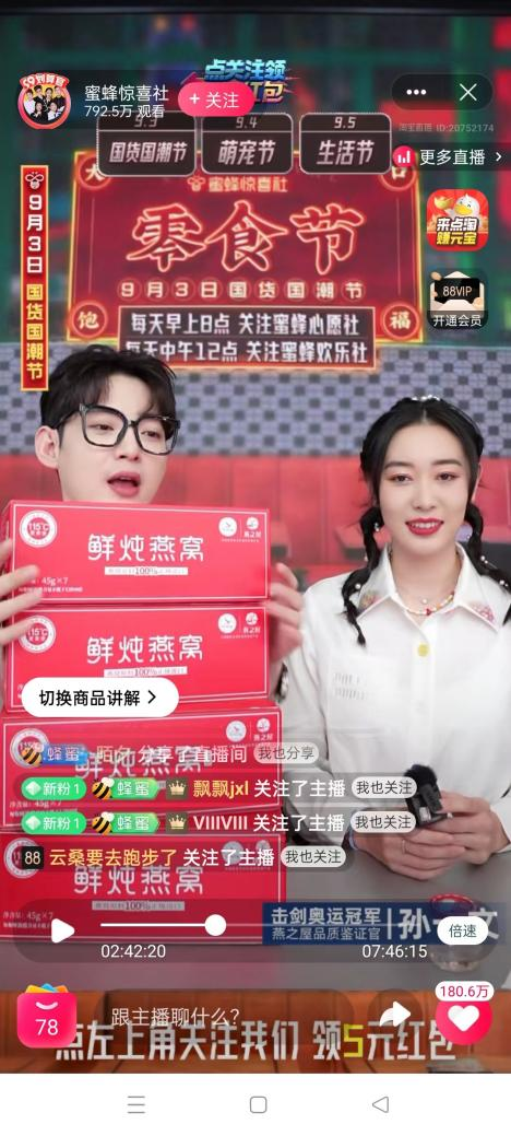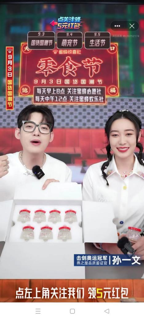 直播开始,孙一文亲切地与粉丝们打招呼,并携手蜜蜂惊喜社主持人在线派送福利,在直播间抽取了5名幸运粉丝送上燕之屋专属福利——115℃鲜炖燕窝月卡。伴随着“5、4、3、2、1”的倒计时,获奖名单揭幕,直播间里人气一路飙升。在随后快问快答的环节中,孙一文与主持人的精彩互动更是逗乐众人,在欢笑的气氛中,传递出燕窝产品背后的滋补文化。众所周知,国家运动员的饮食标准十分严格,除了健康,更重要的还有安全。孙一文也在直播中和大家分享,从健康出发,所有入口的食品都必须经过兴奋剂检测。