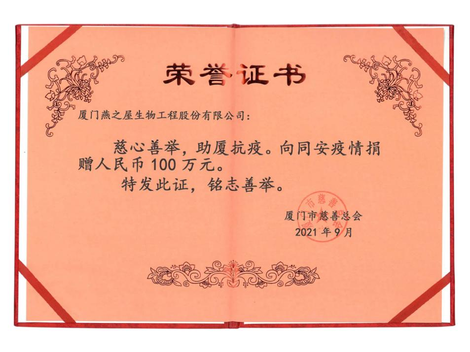 图:燕之屋向同安疫情捐赠人民币100万元,获厦门市慈善总会颁发荣誉证书