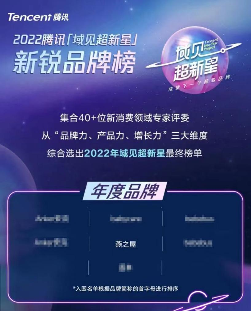 近日,2022腾讯「域见超新星」新锐品牌榜单发布,燕之屋实力上榜,荣获2022腾讯「域见超新星」新锐品牌「年度品牌」荣誉。