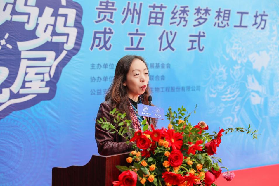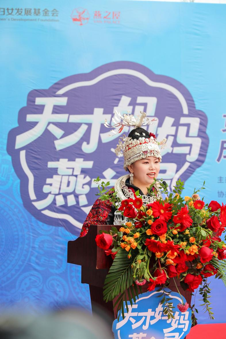 启动仪式上,燕之屋贵州苗绣梦想工坊主理人、贵州古苗疆刺绣工贸有限公司负责人刘英上台为大家分享“天才妈妈·梦想工坊”背后的故事。她说道:“正式挂牌燕之屋‘天才妈妈·梦想工坊’,为我们传承与发扬苗绣事业,助力乡村振兴赋予了新的使命与愿景。我一个人的力量是有限的,现在有了燕之屋的帮助,我们可以扩大合作社,让更多的绣娘加入到我们的队伍之中,通过培训,用自己的手艺赚钱,改善生活,同时也帮助苗绣更好地传承和传播,我想这就是燕之屋爱的延续。”作为贵州苗绣非遗传承人,刘英不仅创办贵州古苗疆刺绣工贸有限公司,以传承优秀民族文化为基石,着力打造民族品牌,更教授当地妇女刺绣技能,助力少数民族地区农村妇女就业致富。