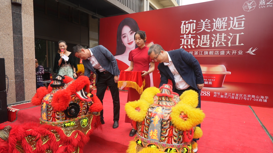 活动伊始,燕之屋湛江代理商莫干安发表开场致辞,拉开了庆典序幕。他首先对各位来宾表示欢迎和感谢,并说道:燕之屋品牌历史悠久,多年来凭借高品质、高价值的产品实力,赢得了众多消费者的青睐。随后,在主持人的邀请下,数位嘉宾手执金剪,共同为燕之屋湛江旗舰店剪下精彩的一刀。红绸刚落,醒狮腾起,这一刻彩炮齐鸣、掌声雷动,燕之屋湛江旗舰店正式开业。瑞狮送福,传递美好祝愿,醒狮点睛,寓意生财利市,开业庆典在热闹喜庆的氛围中圆满结束。