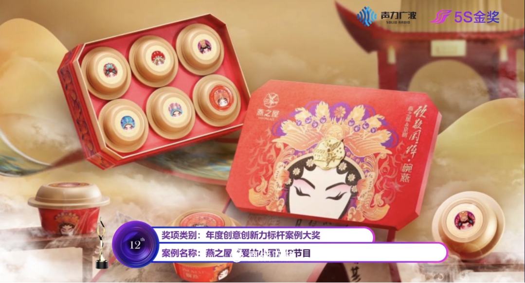 娱乐营销5S金奖创办于2011年,是国内娱乐营销领域历史悠久、有着广泛影响的专业奖项,由国内知名的广告主评论(《广告主》杂志)主办,中国传媒大学广告学院提供学术支持。5S即Strategy(策略)、Spark(闪光创意)、Share(分享)、Sale(销售)、Service(服务)的简称。5S金奖旨在嘉奖那些策略一流、创意新颖、分享踊跃、销售火爆、服务上佳的娱乐营销经典案例,是甲乙双方市场洞察力、创意创新力、口碑传播力、营销实效力、用户服务力的集中体现。燕之屋《爱的小屋》IP节目创新实践广播电台节目营销模式,融合品牌文化理念于节目定位与内容当中,开启品牌与消费者沟通的新渠道,有效传达品牌传播的目标与诉求,深受评审肯定。